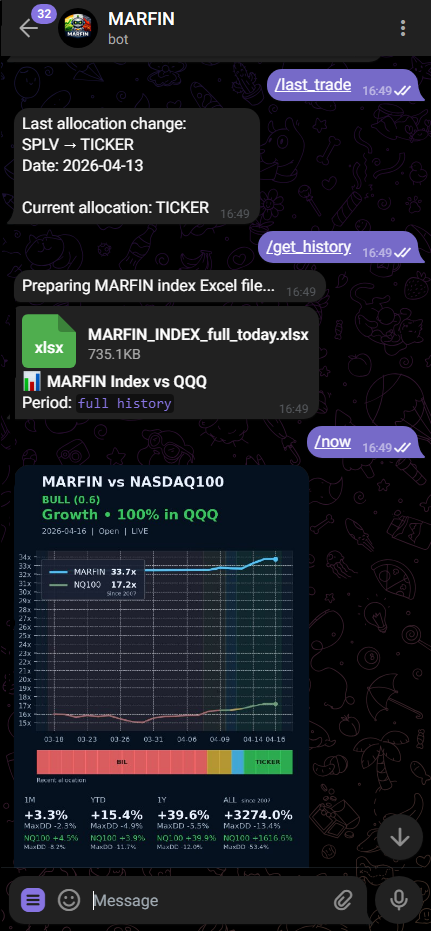 PRO also includes extended MARFIN Index history, trade history, date-range analysis, and comparison against a custom benchmark inside Telegram.